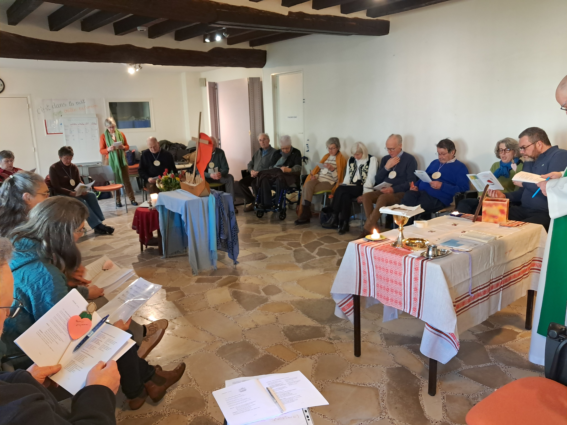 - Nous restons tous assis pendant les temps de prière et les célébrations eucharistiques : tout le monde est au même niveau et cela est confortable pour celles et ceux pour qui se lever et s’asseoir nécessite un gros effort. Au moment de la communion, c’est le célébrant qui se déplace vers chacun pour donner à chacun la Communion.